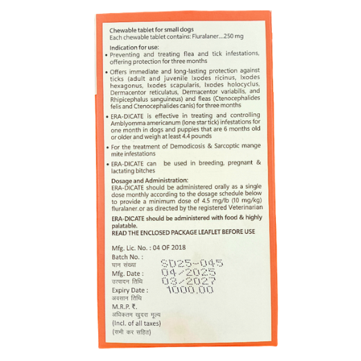 Era-Dicate Fluralaner 250 mg Chewable Tablet for Dogs (4.5–10 kg) | 3-Month Flea & Tick Protection