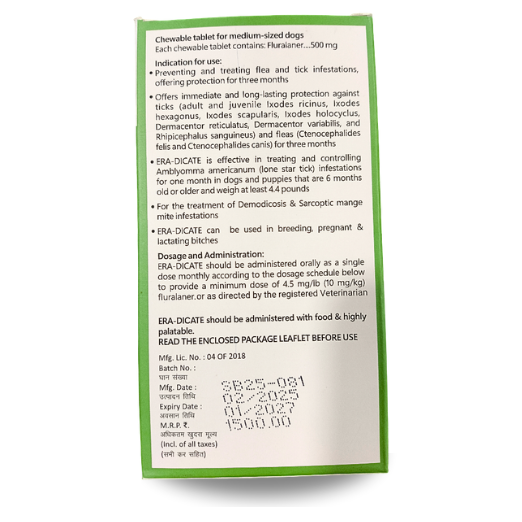 Era-Dicate Fluralaner 500 mg Chewable Tablets for Dogs (10–20 kg) – 3 Months Flea & Tick Protection