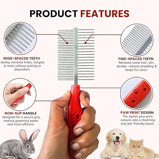 - DUAL DOUBLE-SIDED COMB – Equipped with pins on not one but BOTH sides. Wide path side for loosen knotted hair and fluffy hair, tight path side for combing the part of nose, ear and legs. This dual-sided comb for small dogs, puppies, kittens & cats is the #1 grooming tool among DIY home groomers & professionals.